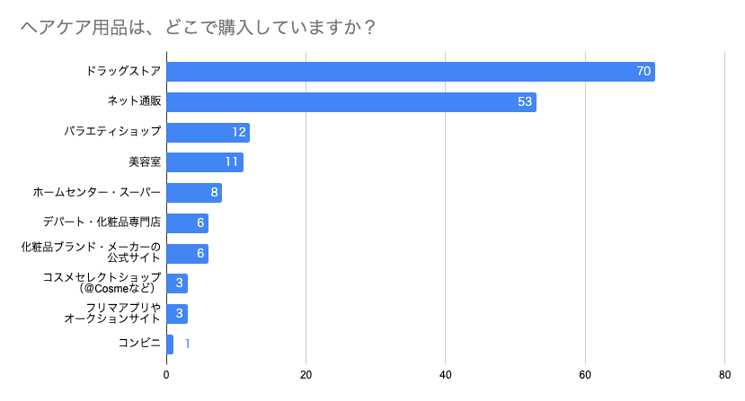 データが示すように、ヘアケア商品を購入する場所の多くはドラッグストアやネット通販。