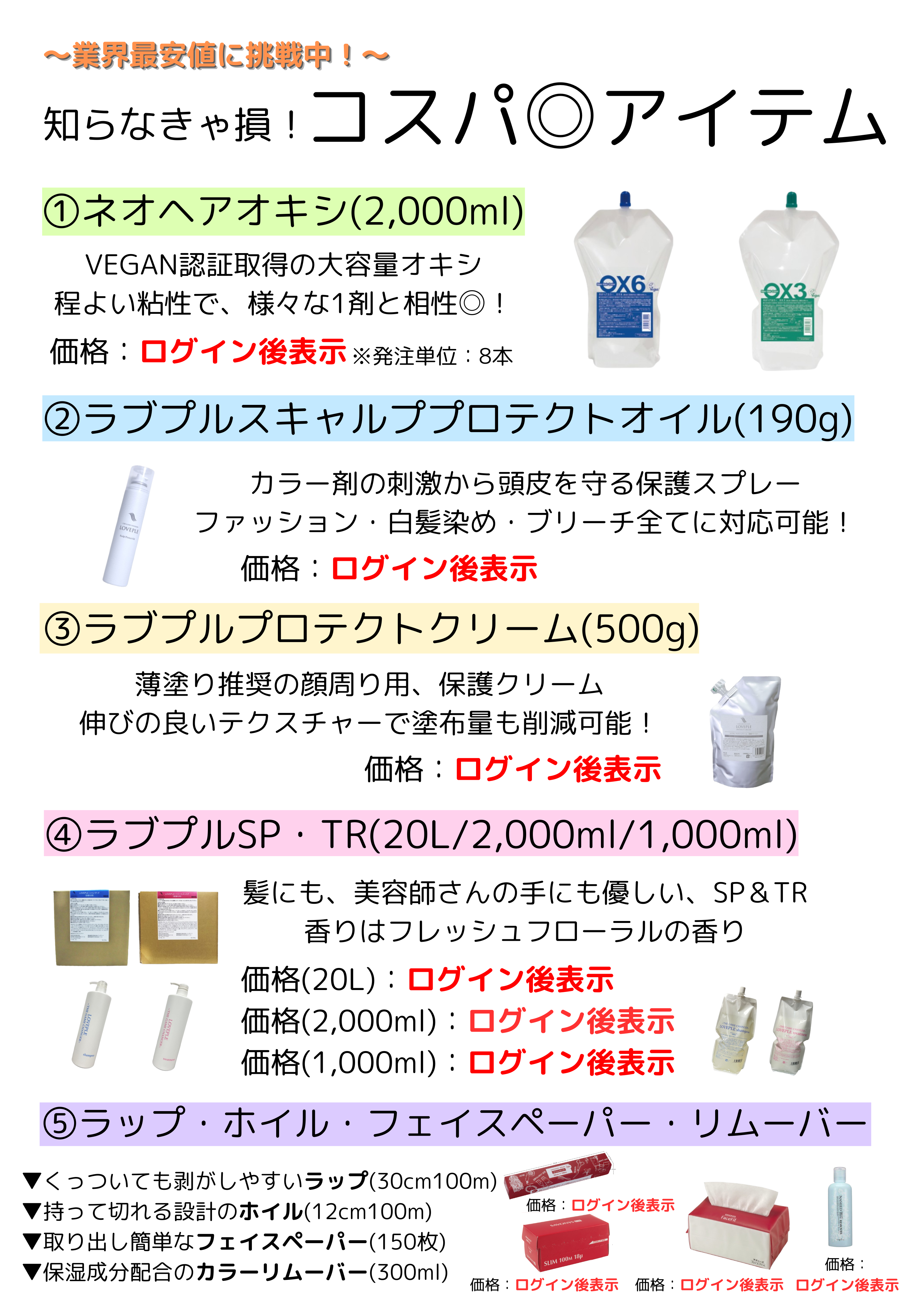 知らなきゃ損!コスパ◎アイテム 表示件数 5件 10件 15件 30件 50件 並び替え カタログ設定順 商品コード(昇順) 商品コード(降順) 商品名(昇順) 商品名(降順) 単価が安い順 単価が高い順 注文数量多い順 注文回数多い順 最終注文日順(昇順) 最終注文日順(降順) カテゴリ順(昇順) カテゴリ順(降順) 全18件 中 1~18件 一括でカートに入れる 品番 4300428 ネオヘアカラーOX【3%】2000ml※発注単位8本 在庫品 / 入数:8 希望小売価格 - 卸価格は会員登録後に表示 会員登録・ログインはこちら 品番 4300429 ネオヘアカラーOX【6%】2000ml※発注単位8本 在庫品 / 入数:8 希望小売価格 - 卸価格は会員登録後に表示 会員登録・ログインはこちら 品番 420080 ラブプル スキャルププロテクトオイル 190g 在庫品 / 入数:0 希望小売価格 - 卸価格は会員登録後に表示 会員登録・ログインはこちら 品番 420081 ラブプル プロテクトクリーム 500g 在庫品 / 入数:0 希望小売価格 - 卸価格は会員登録後に表示 会員登録・ログインはこちら 品番 420082 ラブプル シャンプーF 20L 在庫品 / 入数:1 希望小売価格 - 卸価格は会員登録後に表示 会員登録・ログインはこちら 品番 420083 ラブプル トリートメントF 20L 在庫品 / 入数:1 希望小売価格 - 卸価格は会員登録後に表示 会員登録・ログインはこちら 品番 420084 ○【単品】ラブプル シャンプーF 1000ml 在庫品 / 入数:1 希望小売価格 ¥ 2,000 卸価格は会員登録後に表示 会員登録・ログインはこちら 品番 420085 ○【単品】ラブプル トリートメントF 1000g 在庫品 / 入数:1 希望小売価格 ¥ 2,000 卸価格は会員登録後に表示 会員登録・ログインはこちら 品番 429901 ○【企画】ラブプル シャンプーF 1000ml 12本(10+2) 在庫品 / 入数:1 希望小売価格 - 卸価格は会員登録後に表示 会員登録・ログインはこちら 品番 429902 ○【企画】ラブプル トリートメントF 1000g 12本(10+2) 在庫品 / 入数:1 希望小売価格 - 卸価格は会員登録後に表示 会員登録・ログインはこちら 品番 420086 ○【単品】ラブプルシャンプーF 2000ml(リフィル) 在庫品 / 入数:1 希望小売価格 ¥ 2,800 卸価格は会員登録後に表示 会員登録・ログインはこちら 品番 420087 ○【単品】ラブプルトリートメントF 2000g(リフィル) 在庫品 / 入数:1 希望小売価格 ¥ 2,800 卸価格は会員登録後に表示 会員登録・ログインはこちら 品番 429910 ○【企画】ラブプルシャンプーF 2000ml(リフィル) 6本(5+1) 在庫品 / 入数:1 希望小売価格 - 卸価格は会員登録後に表示 会員登録・ログインはこちら 品番 429911 ○【企画】ラブプルトリートメントF 2000g(リフィル) 6本(5+1) 在庫品 / 入数:1 希望小売価格 - 卸価格は会員登録後に表示 会員登録・ログインはこちら 品番 13401 ナシード ステインリムーバー 300ml 在庫品 / 入数:6 希望小売価格 - 卸価格は会員登録後に表示 会員登録・ログインはこちら 品番 871848 サボニーズ フェイスフィット(150枚入) 在庫品 / 入数:48 希望小売価格 - 卸価格は会員登録後に表示 会員登録・ログインはこちら 品番 891053 サボニーズホイル(12cm*100M)18ミクロン 在庫品 / 入数:15 希望小売価格 - 卸価格は会員登録後に表示 会員登録・ログインはこちら 品番 871577 サボニーズラップ スリムタイプ(30cm*100m) 在庫品 / 入数:36 希望小売価格 - 卸価格は会員登録後に表示 会員登録・ログインはこちら 全18件 中 1~18件 一括でカートに入れる