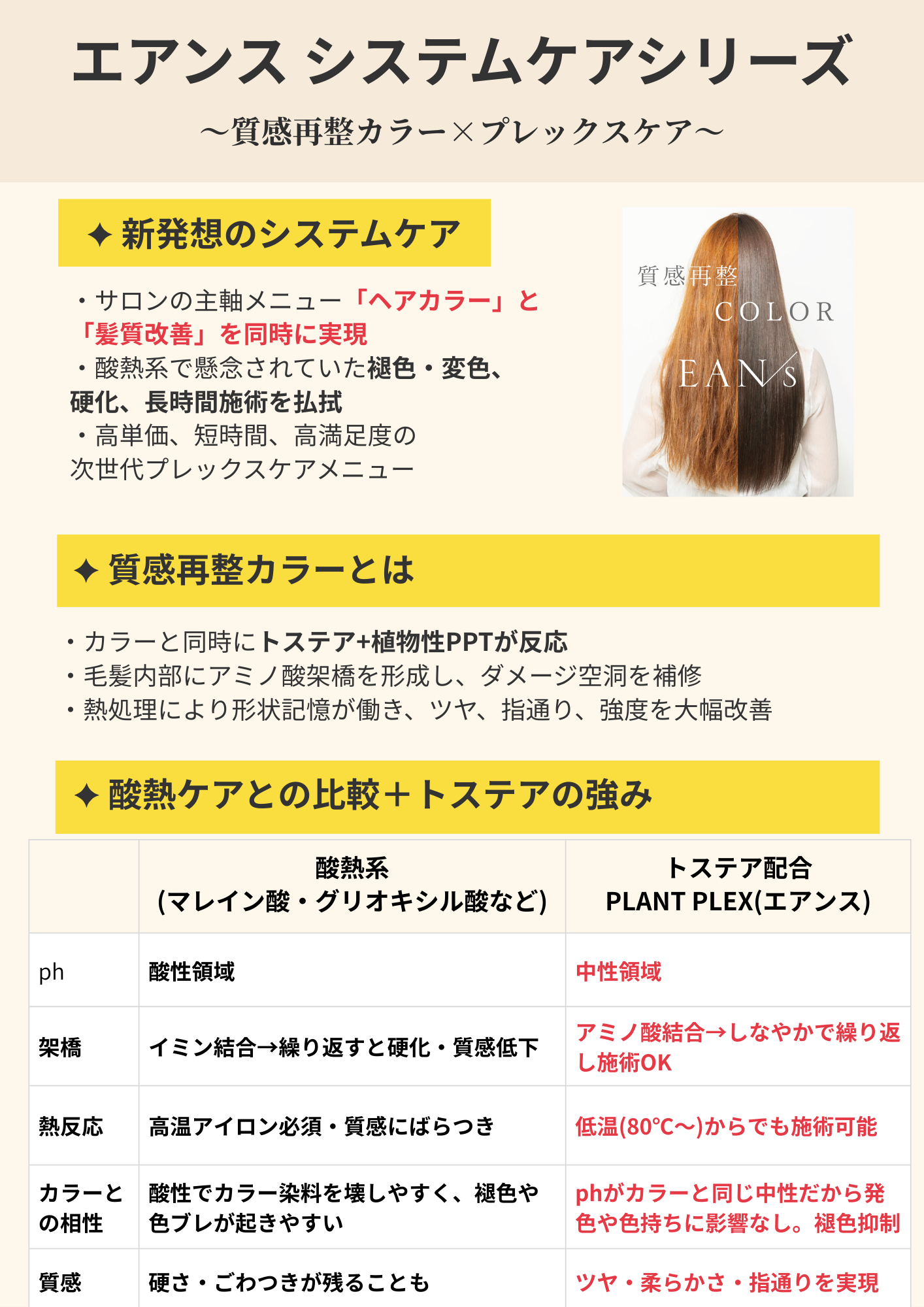 従来の酸熱系ケアが抱えていた褪色・硬さ・施術負担に対し、 トステア×植物性PPTによるPLANT PLEX設計でアプローチ。