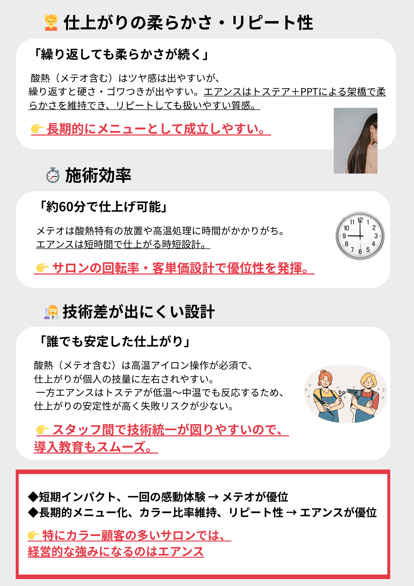 一方で、繰り返し施術による硬さやゴワつき、褪色・色ブレ、 高温操作による技術差はカラー比率が高いほど課題になりやすい傾向があります。