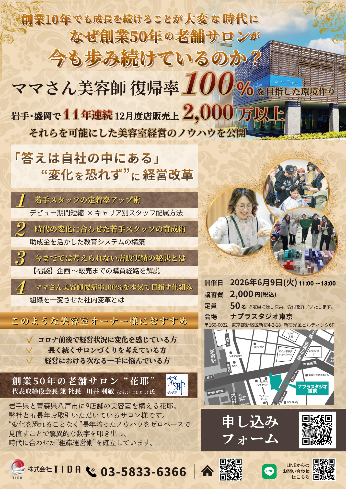 東京6月9日(火)|11:00〜13:00~なぜ創業50年の老舗サロンが今も歩み続けているのか?~会場ナプラスタジオ東京東京都新宿区新宿4-2-18新宿光風ビルディング6F参加費2,000円(税込) ※お支払い方法:口座振替 / クレジットカード定員50名・事前申し込み必須です。・定員に達し次第、受付を終了させていただきます。 GUEST SPEAKER 岩手・青森で9店舗展開 / 創業50年 代表取締役会長 兼 社長 川井 利敏 氏 サロンHPはこちら ‘‘変化を恐れることなく’’長年培ったノウハウをゼロベースで見直すことで驚異的な数字を叩き出し、時代に合わせた‘‘組織運営術’’を確立しています。 お申込みはこちら → ※ご不明点等はTIDA営業もしくは下記の公式LINEまでご連絡をお願いいたします。 公式LINEはこちら