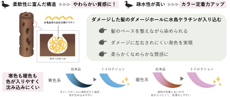 水鳥ケラチンで毛髪内部を整えながら染めることで、 ダメージ部への沈み込みを抑え、ニュアンスカラーやブラウン表現を より均一で美しく仕上げます。